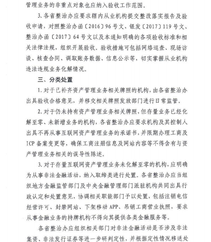 存量业务未化解至零者:明确为从事非法金融活动,纳入取缔类进行处置,包括注销电信经营许可、封禁网站、下架移动APP、吊销工商执照,从事金融业务的持牌机构不得为其提供各类金融服务等。