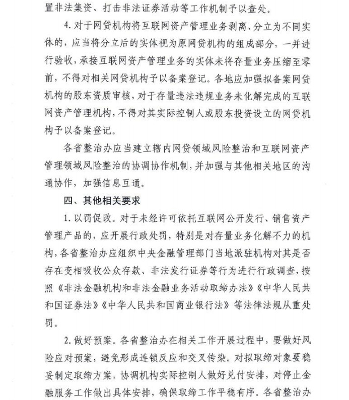 此外,通知中还提到,对于网贷机构将互联网资产管理业务剥离、分立为不同实体的,应当将分立后的实体视为原网贷机构的组成部分,一并进行验收;承接互联网资产管理业务的实体未将存量业务压缩至零前,不得对相关网贷机构予以备案登记。