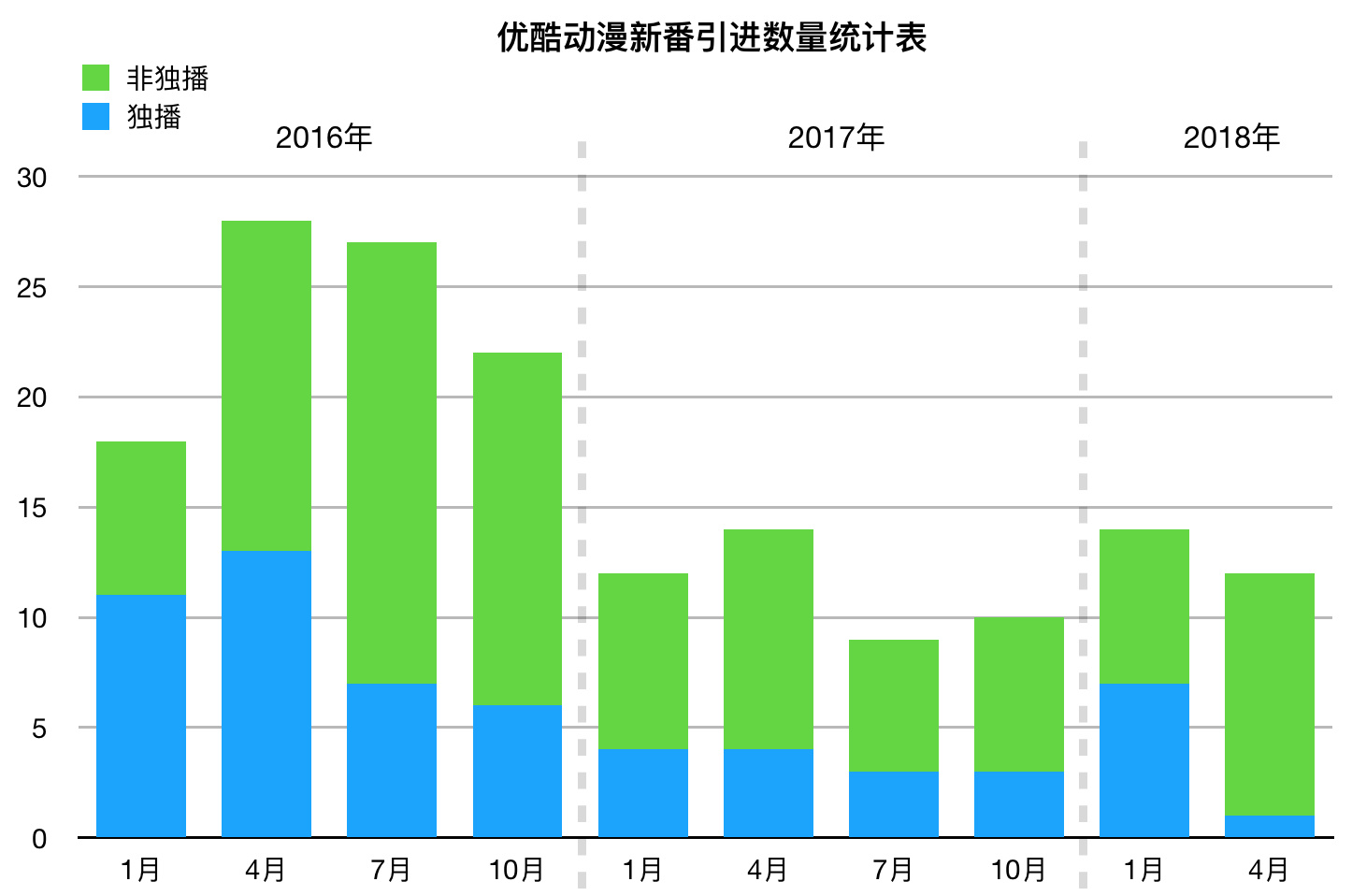 以目前优酷动漫公布的信息来看,在2018年的4月新番中,该平台目前只有《魔法少女网站》这1部独播动画,而其余11部非独播动画其实也均能在B站、爱奇艺动漫看到。可以说,无论是独播权的争抢力度还是宣传推广,优酷动漫在新番动画的引进上在这一季其实是不太给力的。
