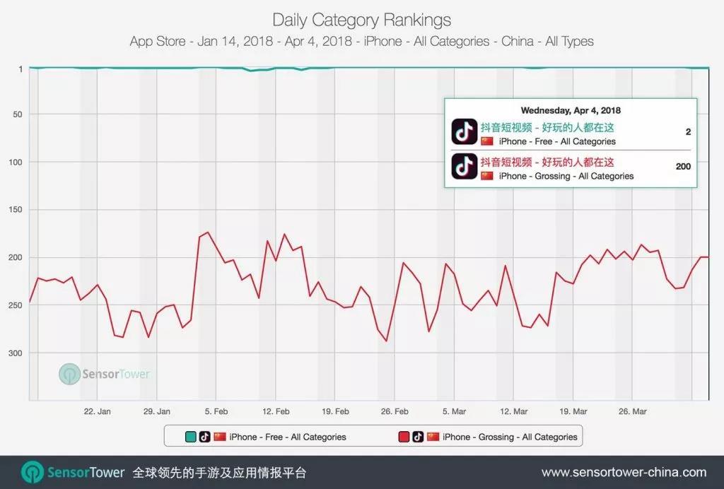 从 1 月中旬,到今天,抖音在 App Store 免费榜的排名基本都是前三甲,其中大部分时间是第一,过往战绩比抖音还强悍的,只有一个王者荣耀了。