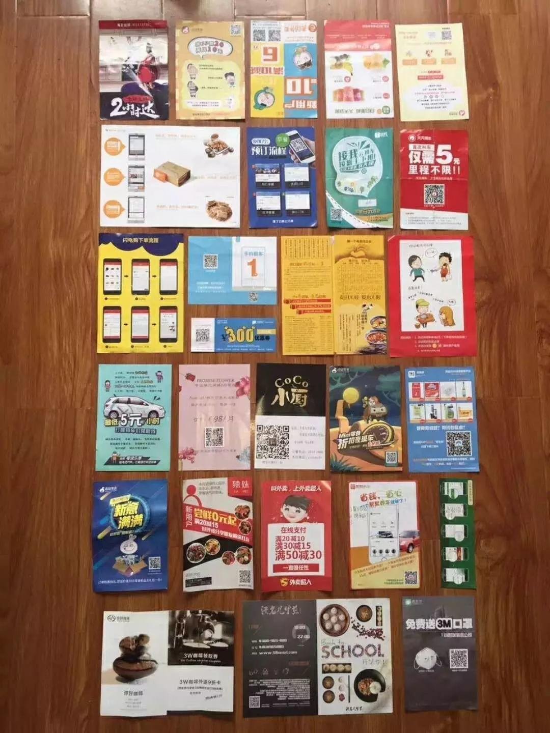 每当我头脑发热要去盲目追逐风口的时候,我就会翻出这张照片看一看,这是我2016年末拍的一张照片,记录了那一整年我在中关村上班途中收集到的所有传单——然而当你仔细看就会发现,这张图差不多就是“中国O2O死亡不完全名单。”