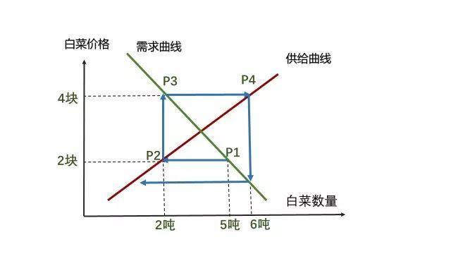 好,到了第二年,真的只有2吨供给的时候,价格又飙升到了4块(P3点),这时候很多菜农又会想:4块有钱赚,明年我还是继续种白菜——生产6吨(P4点),于是价格不平衡就会像蛛网一样持续下去。