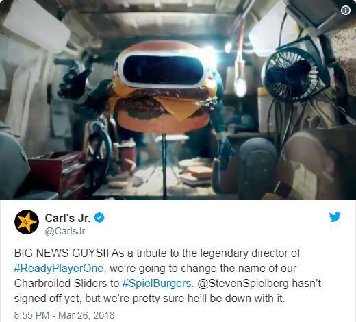 宣传期间掀起最大波澜的事件之一是Carl Jr的“斯皮尔堡格”病毒营销, 这本来是一个通过社交平台传播的笑话。这件事源起该汉堡连锁店声称他们将新的菜单重新命名为“斯皮尔堡格”,为了向斯皮尔伯格致敬。Carl's Jr.创造了一个突破性的社交媒体时刻,他利用了标志性的斯皮尔伯格电影,其中包括《头号玩家》,让电影在开画周获得了一定的关注。