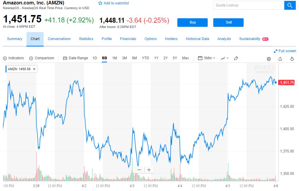 但特朗普的推文并没有对亚马逊股价造成太大影响。周四盘前亚马逊股价一度下跌4%,但开盘后反弹上涨,最终收涨2.92%。