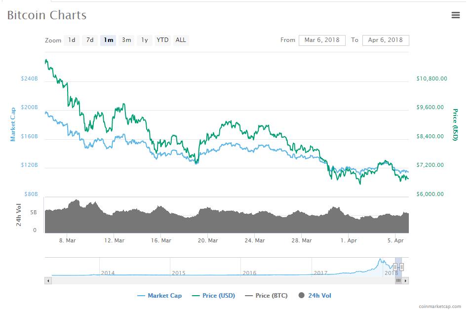 追踪多家数字货币交易平台价格和市值的Coinmarketcap网站显示,截至发文,比特币交易价处于6800美元下方,处于将近两个月来最低点。