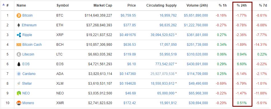 包括比特币在内,市值前十位的数字货币之中,有七只最近24小时累跌。