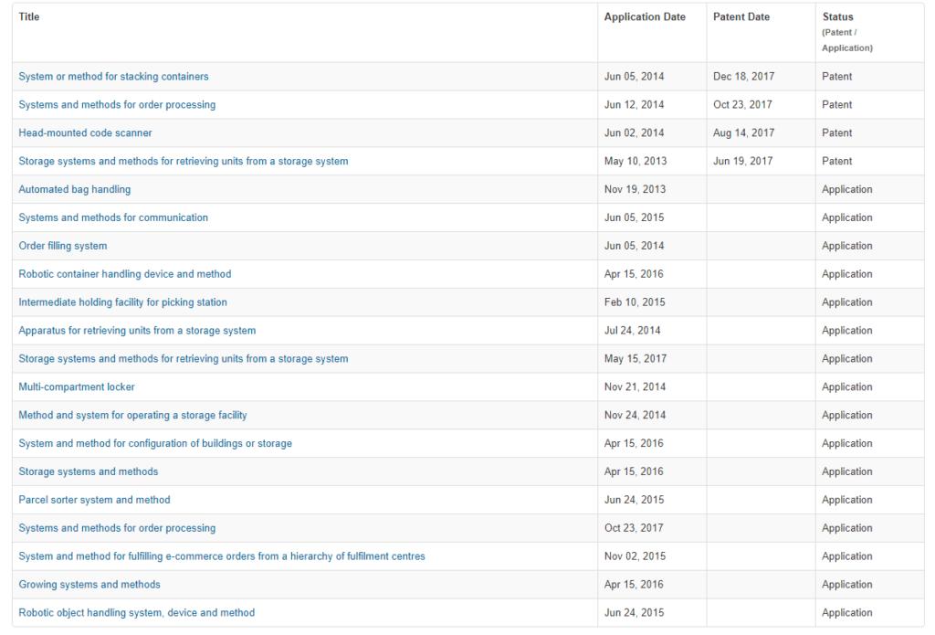 在CB Insights 平台搜索发现,Ocado在美国提交的专利显示了该公司一直在研究的仓库自动化技术的类型有:包裹分拣器、机器人物品处理、自动化包装处理等等。