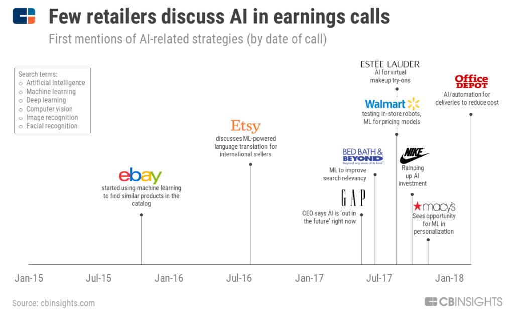 在我们对50多家美国顶级上市零售商(包括Etsy和eBay等电子商务网站)的1600多份财报电话会议记录进行分析时,仅有9家零售公司提到了与其网站或实体店相关的人工智能策略。(注:我们的分析排除了像亚马逊这样的大型科技公司)。
