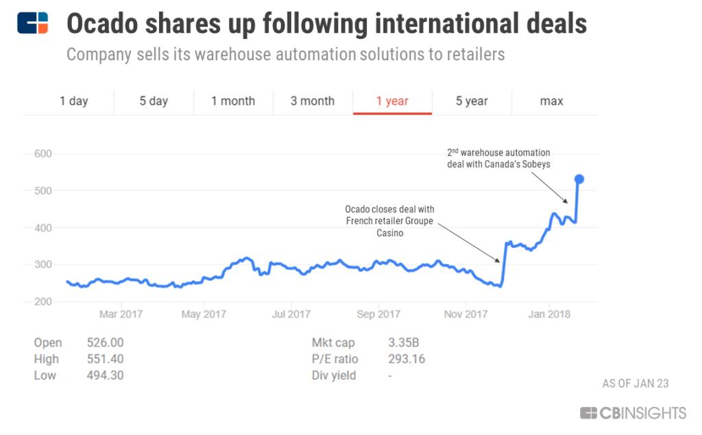 2017年第四季度,Ocado与法国食品杂货巨头Groupe Casino建立了合作伙伴关系,使Ocado的股价暴涨。作为合作的一部分,Ocado将为Groupe Casino构建“最新一代、最先进的自动化仓库”,在软件方面,提供前端Web界面和最后一英里交付路线规划等解决方案。
