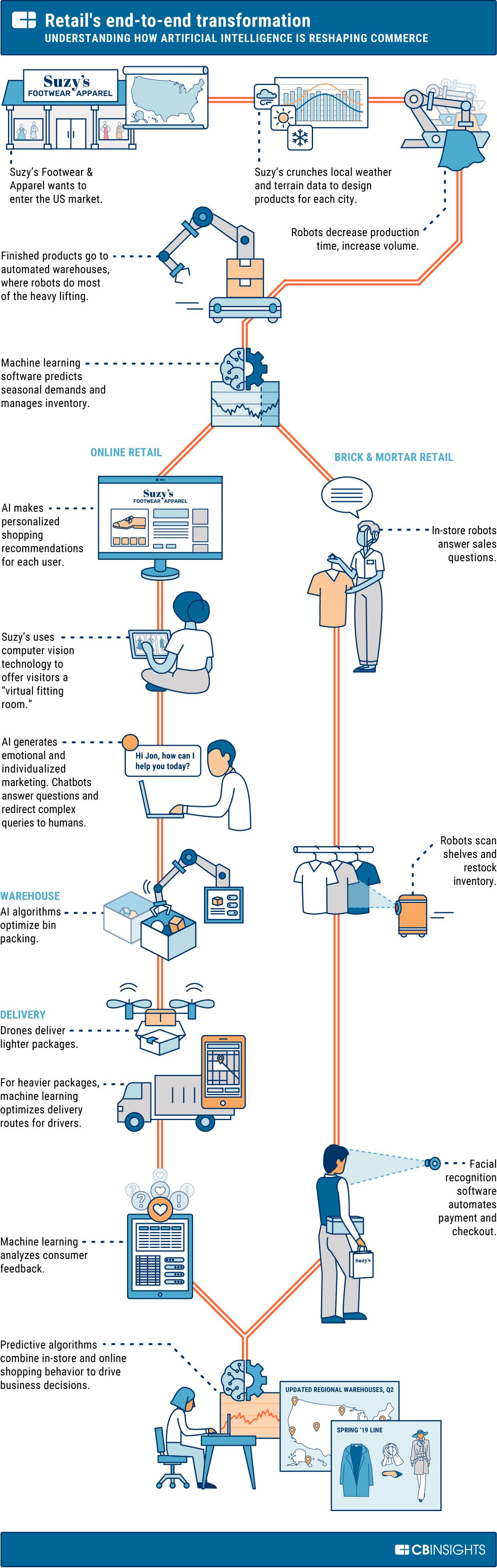 电子商务巨头亚马逊和阿里巴巴可能会利用大数据和人工智能,来部署侧重于整体零售体验(包括线上和线下)的端到端解决方案。然而,大多数零售商都在将它们从人工智能那里获得的启发,集中运用在零售链的更具体的环节。