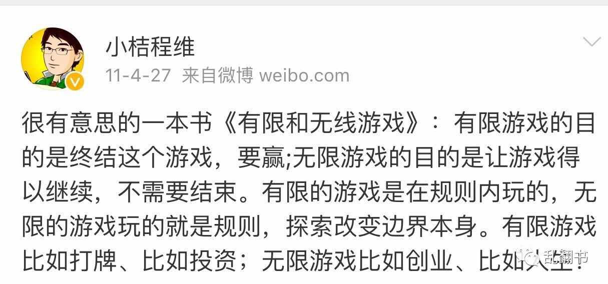 谜底应该是一本书,《有限和无限游戏》,王兴边界与终局的思维模式就是来自这本书。 有限游戏以取胜为目的,而无限游戏以延续游戏为目的。有限游戏是画地为牢的游戏,旨在以一位参与者的胜利终结比赛。我们迫切需要一个“游戏观”的转换,即从有限的游戏转向无限的游戏。