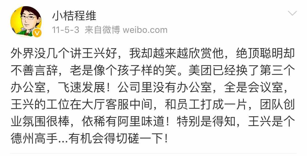 在千团大战恶性竞争的11年,常遇春不管在微博上还是支付宝内部的培训里,都表达了对王兴和美团的看好。