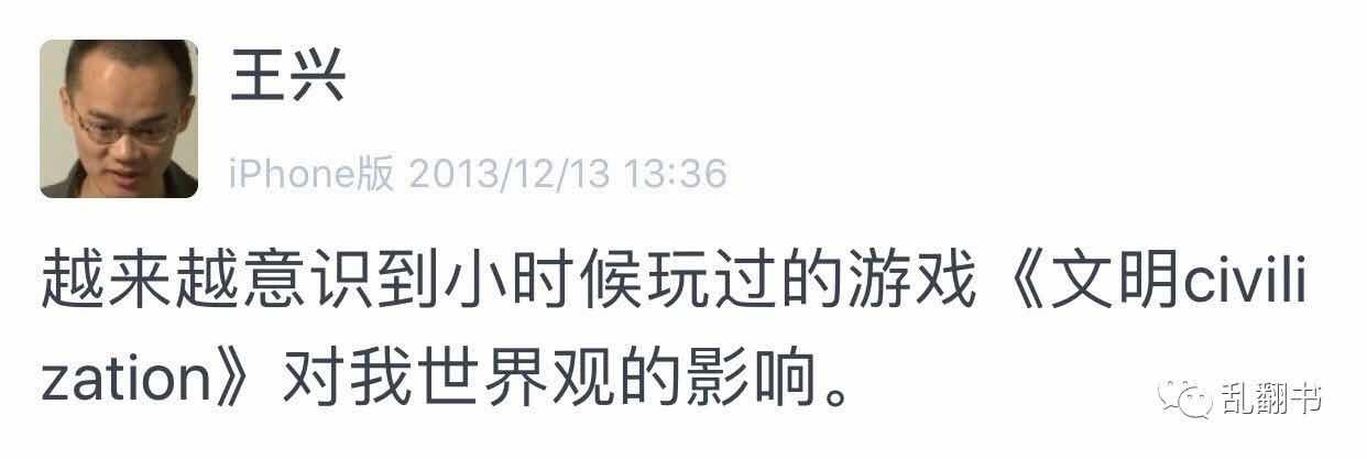 王兴的世界观受《文明》影响,一个自己造国家的回合策略游戏。回合策略制,没有终点,国土面积越大越好,信奉战争和掠夺才是王道,尤其是闪电战,发动战争不需要借口,原子弹决定了所有文明对你的真正态度。