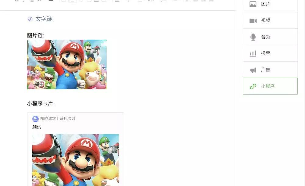 除了单纯的「小程序关联通知」,微信还允许我们在微信推文中,直接插入小程序卡片或链接。只要完成小程序与公众号的关联操作(请见上一步),就可以在文章中插入小程序。