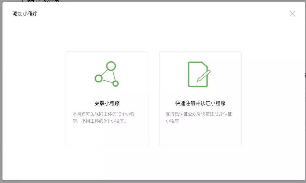 在「小程序管理」页面,点击右上角的「添加」按钮,在弹出的窗口中选择「关联小程序」。公众号管理员扫码后,就能填入小程序的 AppID,并选择小程序是否需要推送给用户、是否在公众号页面展示。