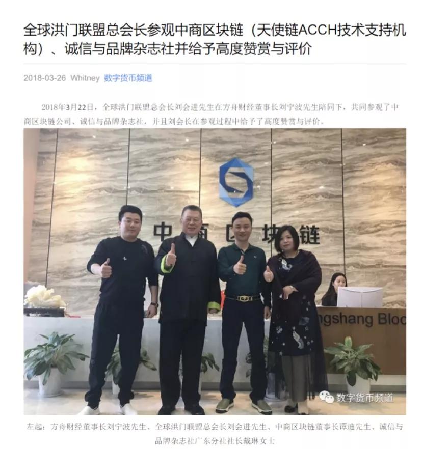 一则新闻称:全球洪门联盟总会长参观中商区块链(天使链技术支持机构)、诚信与品牌杂志社并给予高度赞赏与评价。