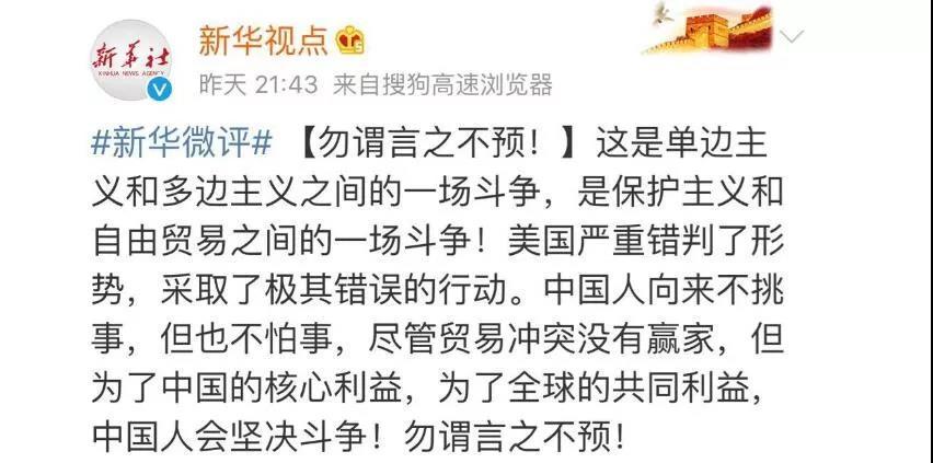 当然,我方也毫不示弱,商务部紧急召开新闻发布会,表示“如果美国公布1000亿美元清单,中国将立刻反击;中国已经做好准备,在应对措施上不会犹豫。中国有非常详细的反制措施,不排除任何选项。”