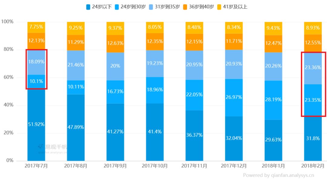 2017年7月-2018年2月抖音APP用户年龄属性 :