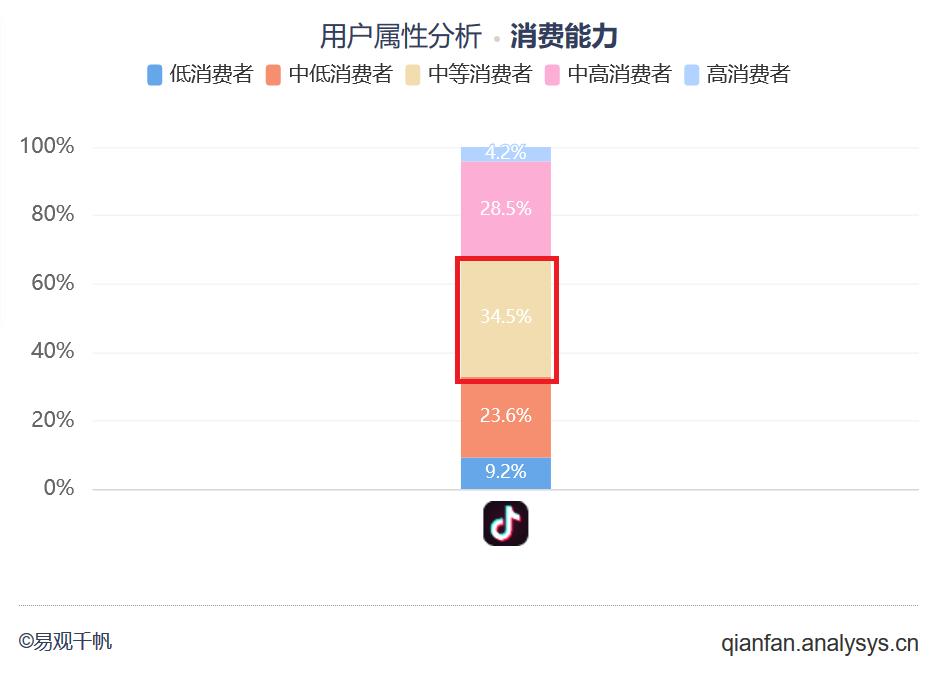 从易观千帆今年2月份数据来看,目前抖音用户消费能力以中等及以上水平为主,且中等及中低群体所占比重趋于上升,对于这一群体来说,物美价廉的隐藏菜单和好玩不贵的个性化小玩具格外具有吸引力。