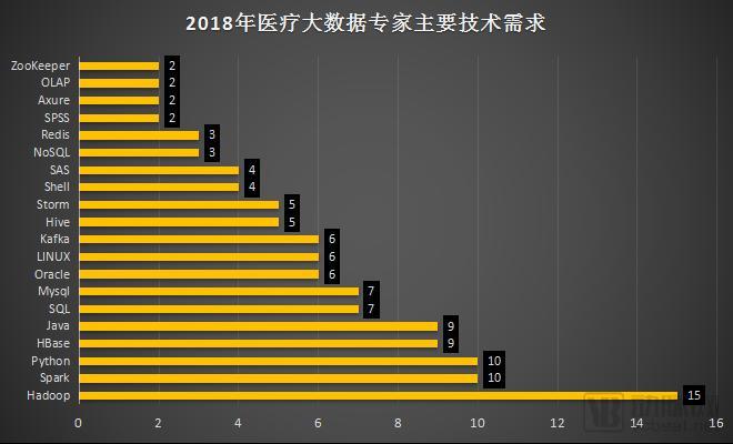 在公布信息的企业中,有80%的医疗大数据职位对于技术的需求在5个及以上。有多达15家企业的大数据岗位都对Hadoop这一分布式系统基础架构做了要求。显然,经过多年的发展,Hadoop这项技术仍然可以称得上是目前医疗大数据公司的敲门砖。