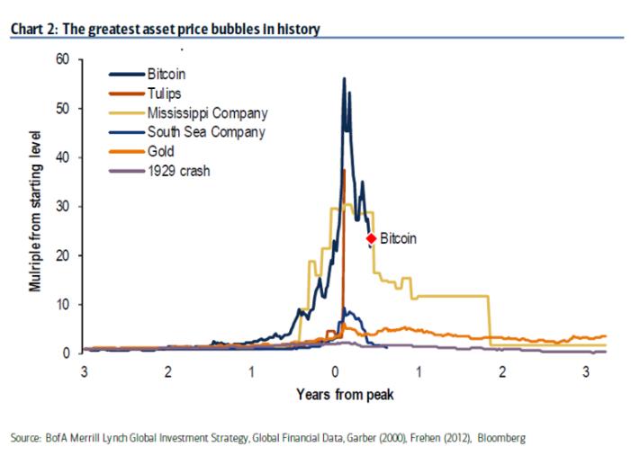 在美银美林看来,作为史上最大的泡沫,比特币正在和郁金香泡沫、南海公司泡沫等历史上的著名经济泡沫一样,进入崩盘期。