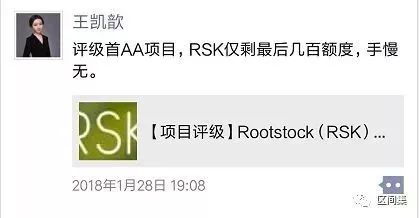 早在代投OKB之前,王凯歆已经涉足币圈代投业务。她在朋友圈中表示:“评级首AA项目,RSK仅剩最后几百额度,手慢无。”