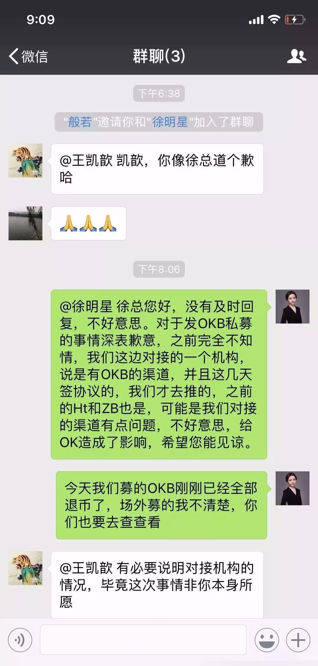 在徐明星发完朋友圈的第二天,王凯歆在朋友引荐下向徐明星道歉,称是对接渠道出了问题,现已退回全部退币。