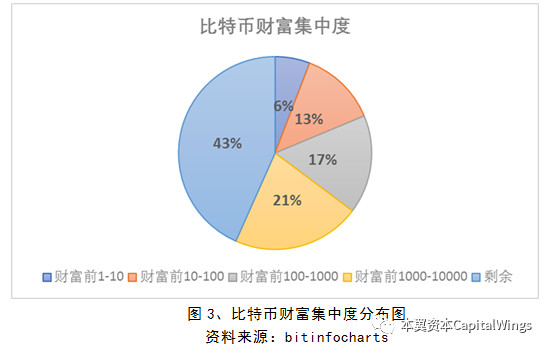 每进行一笔比特币交易,比特币钱包地址便至少增加一个,一般情况下还会增加一个找零地址。假设最极端的情况(一个用户对应只有一个比特币钱包地址),目前比特币钱包地址总计有24,417,615个,即全球最多有2400万人参与,而绝大部分的地址拥有的比特币数目在1比特以下,占总地址的97.193%。拥有1BTC到10BTC的有近54万,占比2.2%。100BTC以上的近15万,占比0.607%。按照当前的比特币价格,持有比特币的百万富翁以上有接近15万人。从财富集中度分析,排名前10,前100,前1000,前10000的地址分别占有比特币总财富的6%、19%、36%以及57%。比特币财富高度集中,前一万人掌握着近60%的比特币资产。