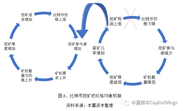 在比特币处于价格上升通道时,尤其在挖矿成本与比特币价差非常大时,这会形成一种正向反馈,不断推动比特币上涨与吸引新矿工的加入。而当比特币进入下降通道时,挖矿者利润降低,矿工人数也随之减少,挖矿难度下降,挖矿成功率上升,单位比特币挖矿成本下降,挖矿利润上升,有可能切换至上涨模式中。排除其他因素(包括监管、黑客攻击等)对比特币价格的干扰,单纯从挖矿成本因素分析,比特币的价格会处于一个涨易跌难的状态,在价格上升时将会快速增长,但如果价格下跌,由参与人数的减少引发的难度降低,矿工获利上升,实现价格的进一步恢复。