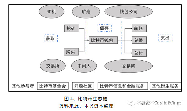 比特币的生态链包含了比特币的获取、存储、支出和技术支持与推广等环节。其中的参与者众多,包括:以挖矿为手段让用户直接获取比特币的矿机供应商和矿池机构;提供比特币存储与支付的比特币钱包公司;提供比特币与法币以及其他虚拟币种交易、兑换的比特币交易所;为比特币提供技术支持与更新意见的开源社区;为比特币推广和维护其稳定发展的比特会基金会等机构组成。