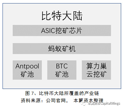 在挖矿领域中,最知名的非比特大陆莫属,其提供的产品和服务包括:以其自身开发的ASIC芯片为核心的蚂蚁矿机,BTC矿池,以及云挖矿服务算力巢;实现了从底层芯片、硬件到应用服务的全产业链覆盖。