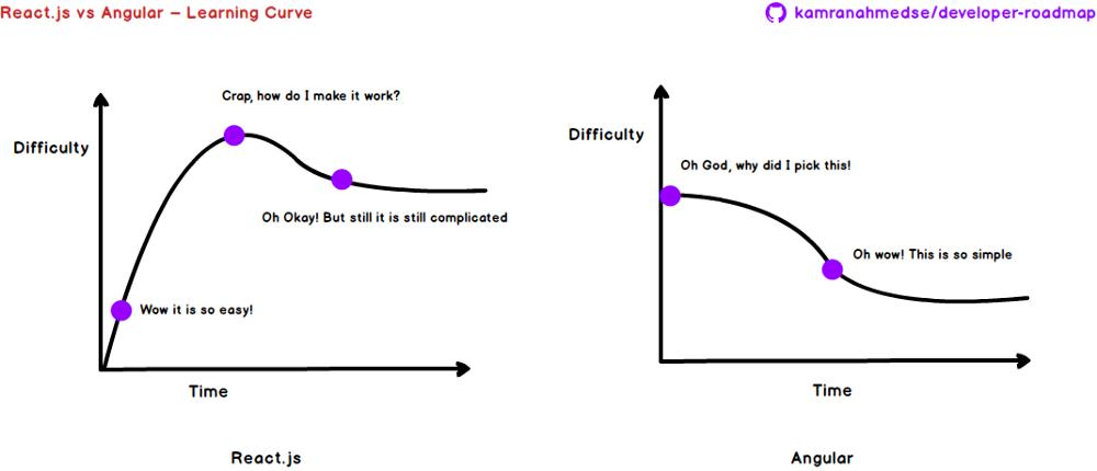 这两个的比较以及我的个人体会我要留到下一篇文章再谈了,不过既然这篇文章是谈学习的,我就来讲讲如何找到Angular和React的学习曲线。