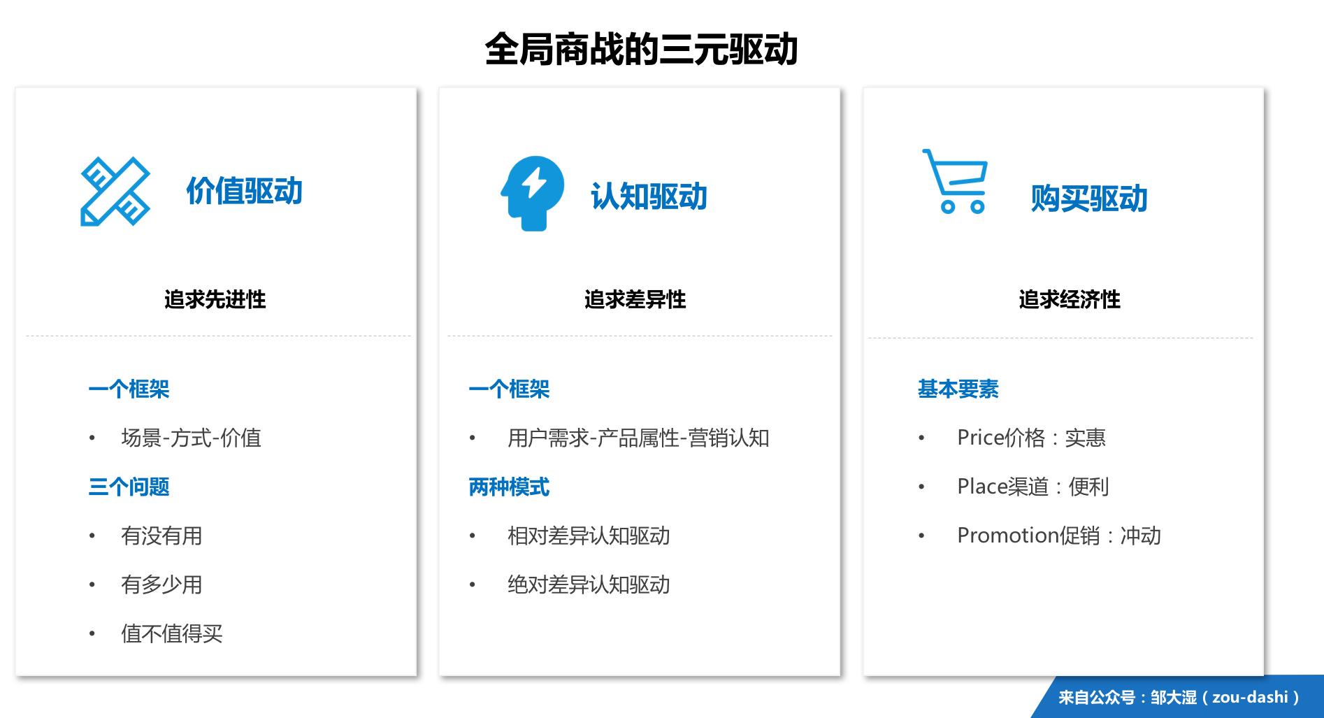 常见的驱动有三种,分别是价值驱动、认知驱动和购买驱动。三维格局里,选错驱动,底层再优秀,也是枉然。