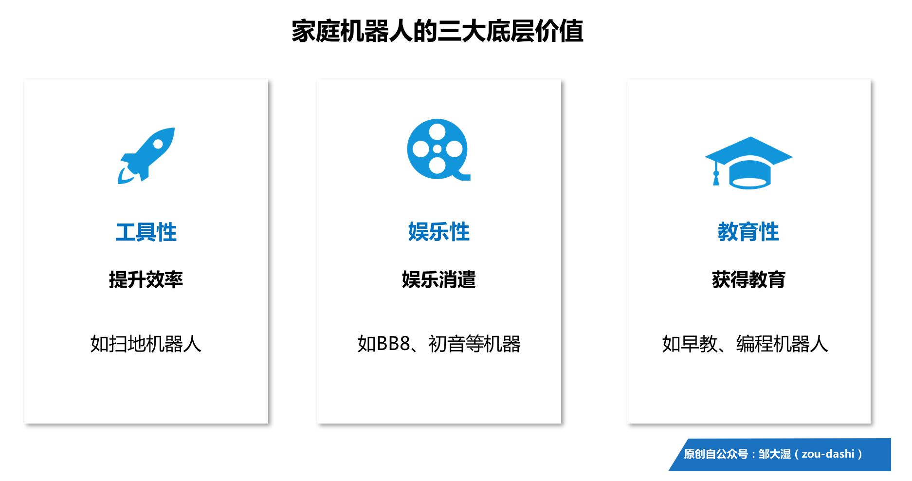 什么是底层的核心价值?就是产品存在最根本的意义,比如耳机的意义是听音乐。如果抛开底层价值,直接谈论上层功能应用,就非常容易陷入到一种盲目自嗨,幻想式设计的初衷。我们在之前文章中举过家庭机器人的底层价值。(参考【邹大湿】2018消费机器人研究报告)