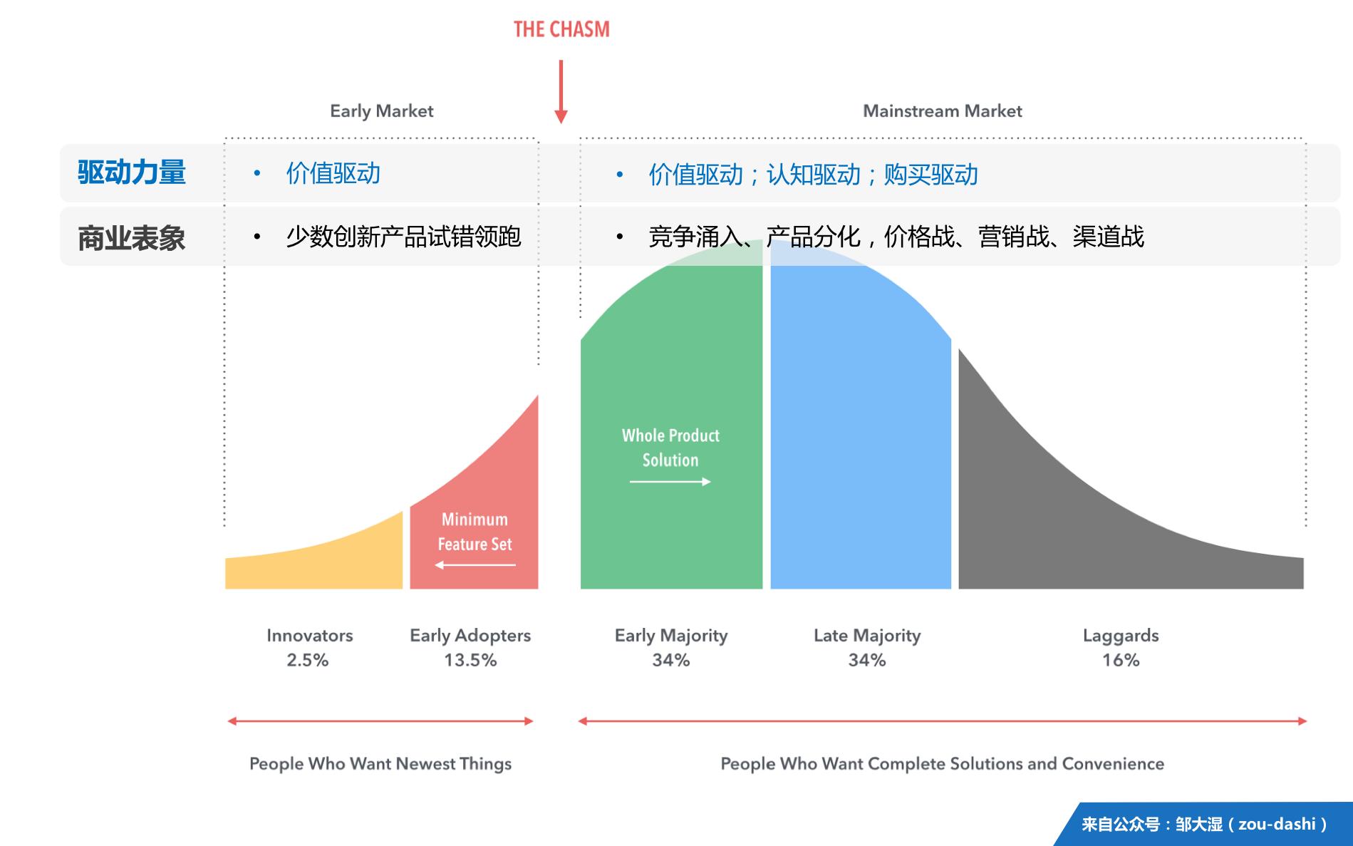 产品在早起需要依靠价值驱动跨越鸿沟。一旦逾越到大众市场,就会进入到价值、认知和购买三驾马车并驾齐驱的阶段。而在商业层面,会表现出价格战、营销战、渠道战等多维竞争。