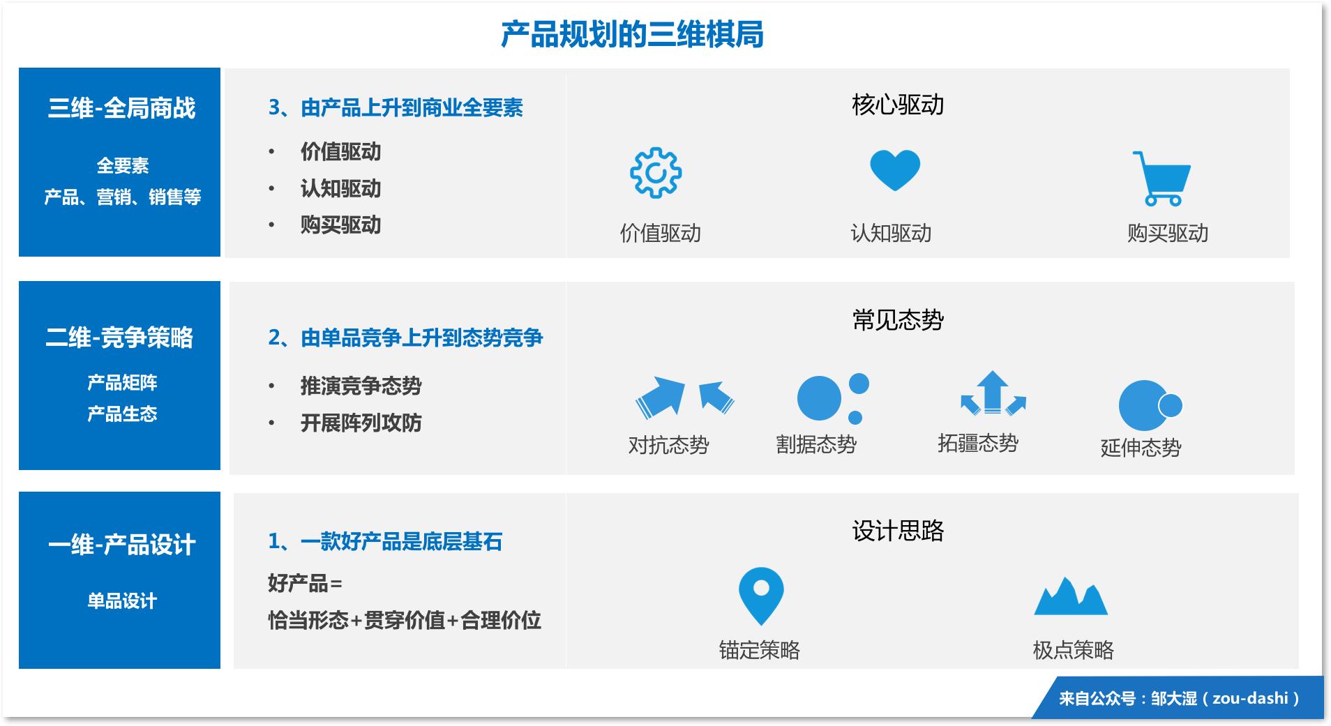 上面的三个案例,分别代表者一款产品成功背后的三个维度,分别是:产品设计、竞争策略和全局商战。这三点就像是由低到高的三维棋局,层层推高,起于纤毫,上抵九天。要想取得产品的全面胜利,每一层每一个要素,都需要通盘考量,不存在简单的一句话战略。