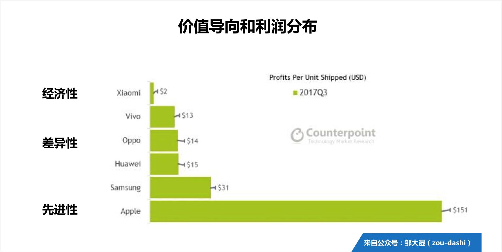 从价值驱动到认知驱动再到购买驱动,其实是产品价值权重一路走低的过程。在创新产品的早期,新功能、新场景,就是撬动市场的最大利器,比如2007年到2011年的iphone;一旦产品成熟,市场增长,差异化的产品就会出现。这个时候,针对差异人群的差异化需求,就可以发起认知驱动的营销战,比如2016年,OPPO推出的R9,时尚外观、美颜拍照、明星代言,强势崛起成一线手机品牌;OPPO崛起的表象,是做了营销,本质是利用营销手段,针对细分用户,放大了价值差异。在市场成熟时期,主打经济性的购买驱动,同样也会奏效。国内典型代表小米,手机、相机、无人机,都是清一色的性价比产品。