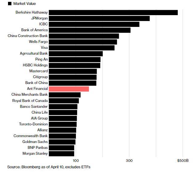 该估值不仅让蚂蚁金服成为世界最具价值的创业公司,还让阿里巴巴集团主席马云创立的这家支付企业晋升为全球市值最高的前15大银行、保险商和授信机构之一。