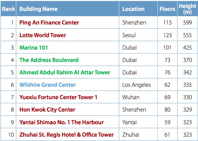 (2017 年完成的 10 座最高摩天大楼,图自 CTBUH)