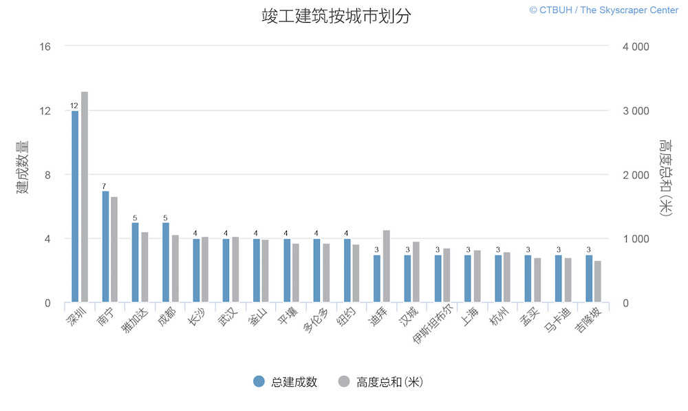 去年,深圳落成的摩天大楼有 12 座,不仅已经是 CTBUH 榜单上连续两年新摩天大楼数最多的城市,甚至比整个美国当年竣工的总数(10 座)都要多。