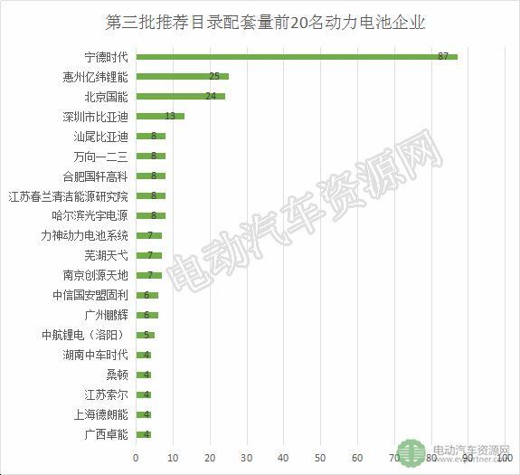 宁德时代在第3批新能源车型目录中排名第一,可配套87款车型