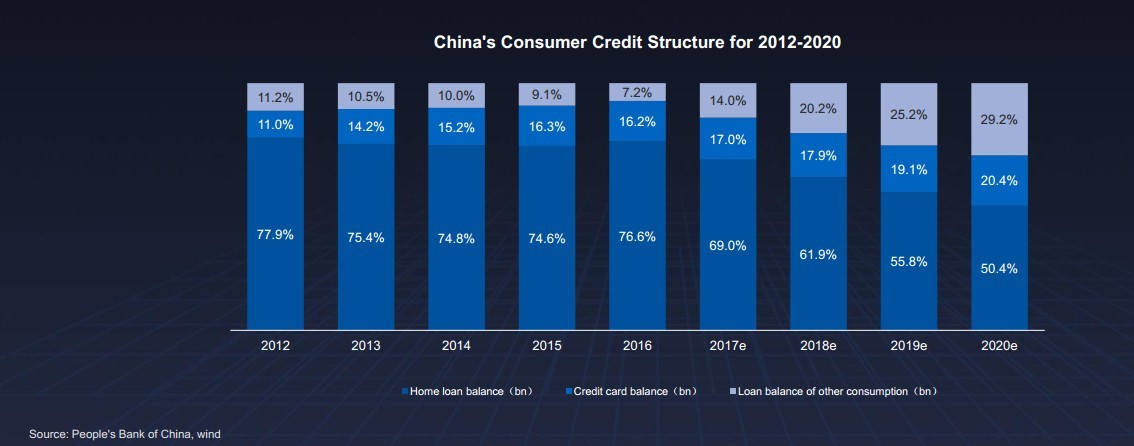 其次,中国消费信贷仍有增长空间。中国居民负债高主要来自于住房按揭,2017年底中国居民债务规模约45万亿,其中按揭超过30万亿,消费信贷只有约8万亿。