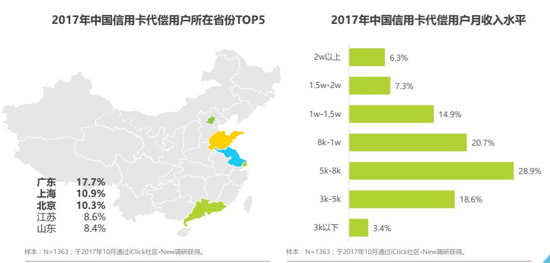 小赢卡贷与艾瑞咨询合作发布的信用卡代偿报告显示,其信用卡代偿的主要用户集中在经济发达省份,年龄18-47岁,月收入以3K-1W为主,男性占六成,八成用户学历在本科及以上