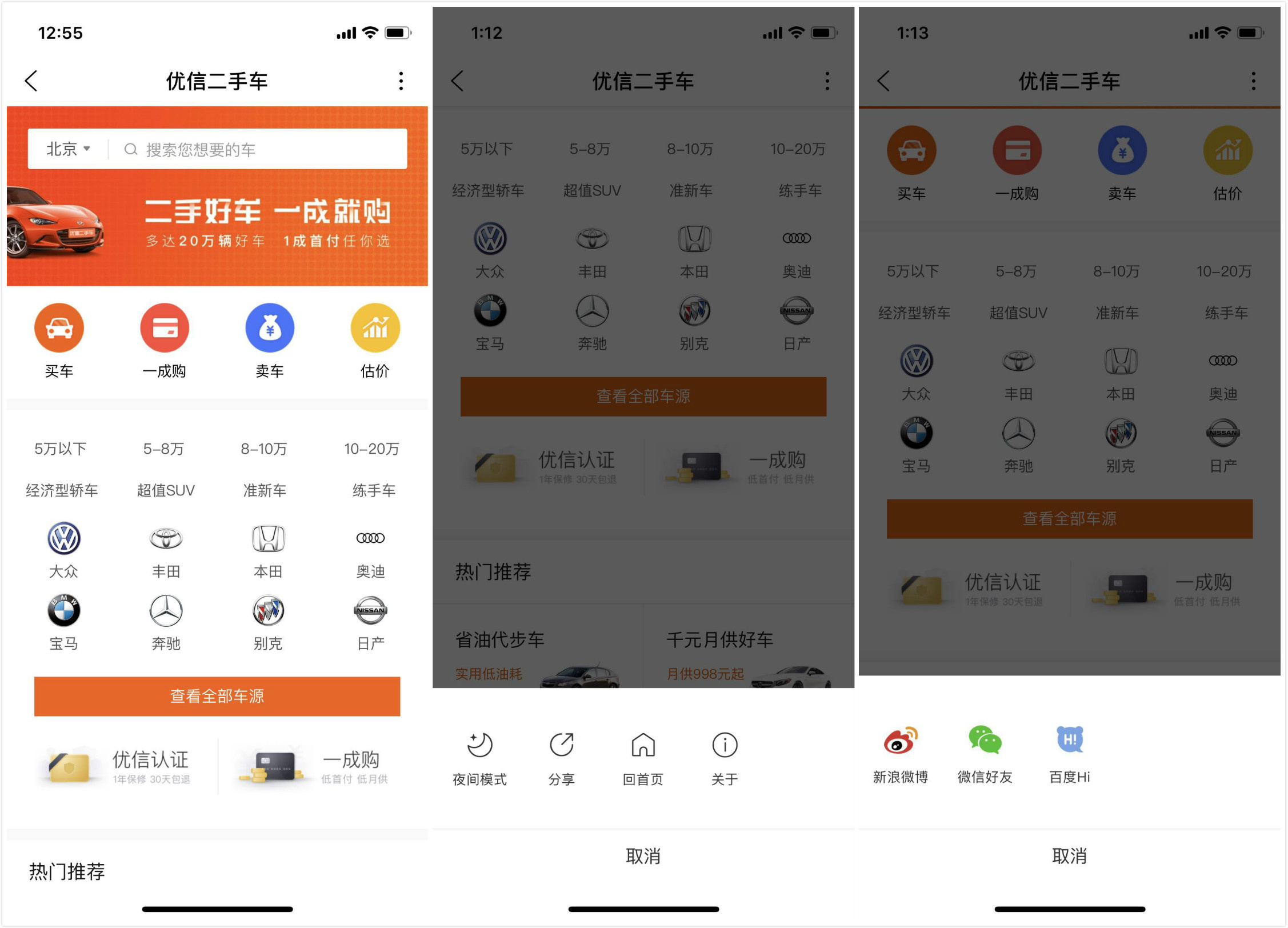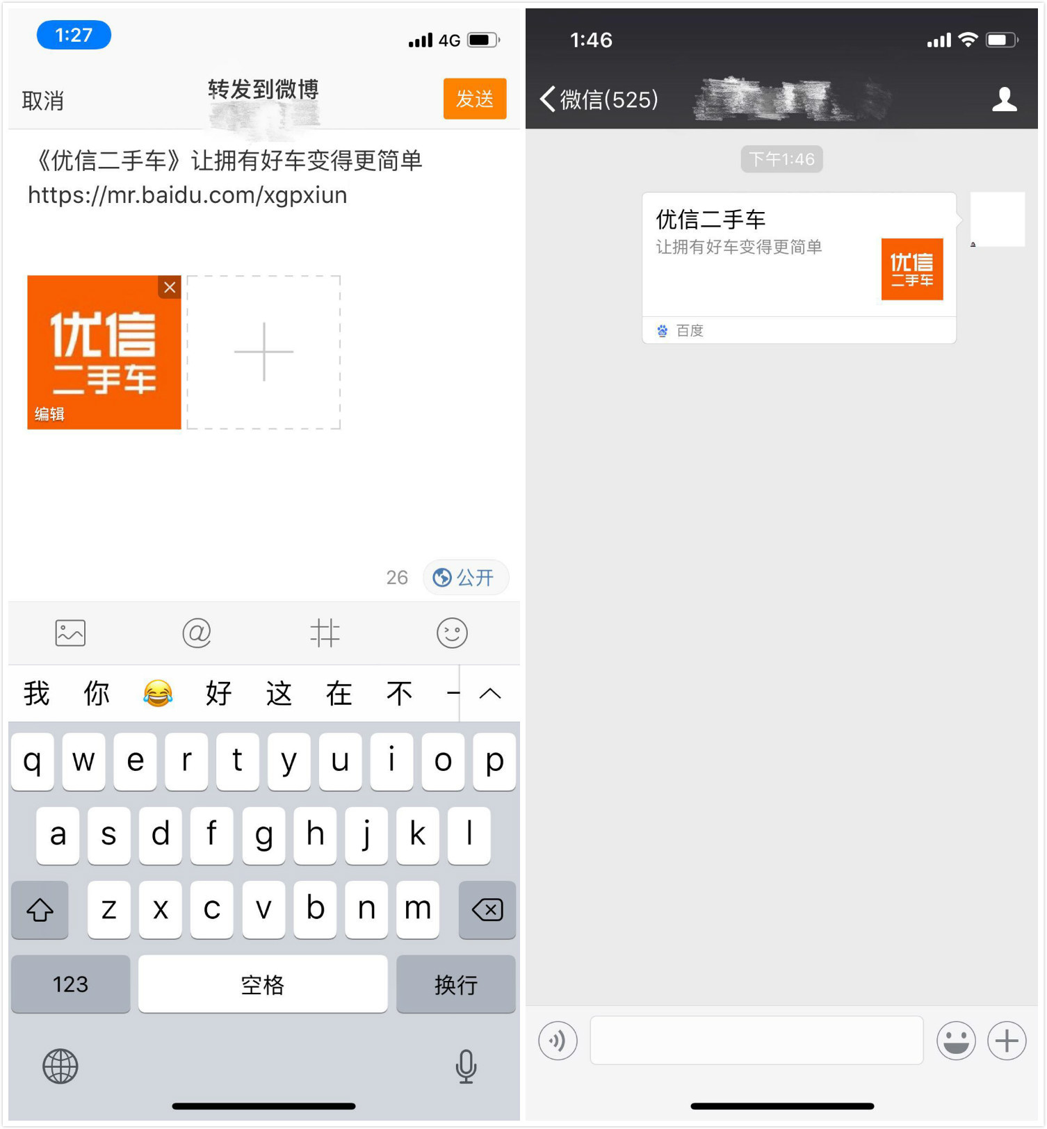 或是因为还在早期(此前微信小程序是开放公测两个月才拆除小程序与微信间信息墙),百度小程序的分享体验较差,从微博和微信分享后的链接点击后都转至百度App的下载界面,即使已有该应用,但并没做深度链接可直接跳转至优信二手车百度小程序。而百度Hi,作为百度失败的产品之一,目前使用者多为百度内部员工,故而36氪没直接体验百度生态内部分享小程序的效果。