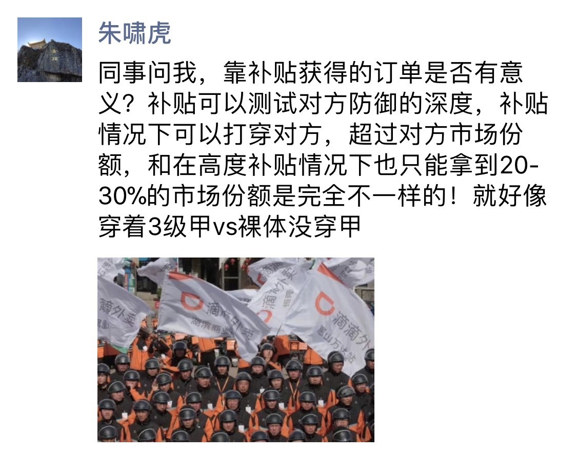 针对滴滴和美团的这些你来我往,朱啸虎在朋友圈中评价称,补贴可以测试对方防御的深度,补贴情况下可以打穿对方,超过对方市场份额,和在高度补贴情况下也只能拿到20-30%的市场份额是完全不一样的!就好像穿着3级甲VS没穿甲。