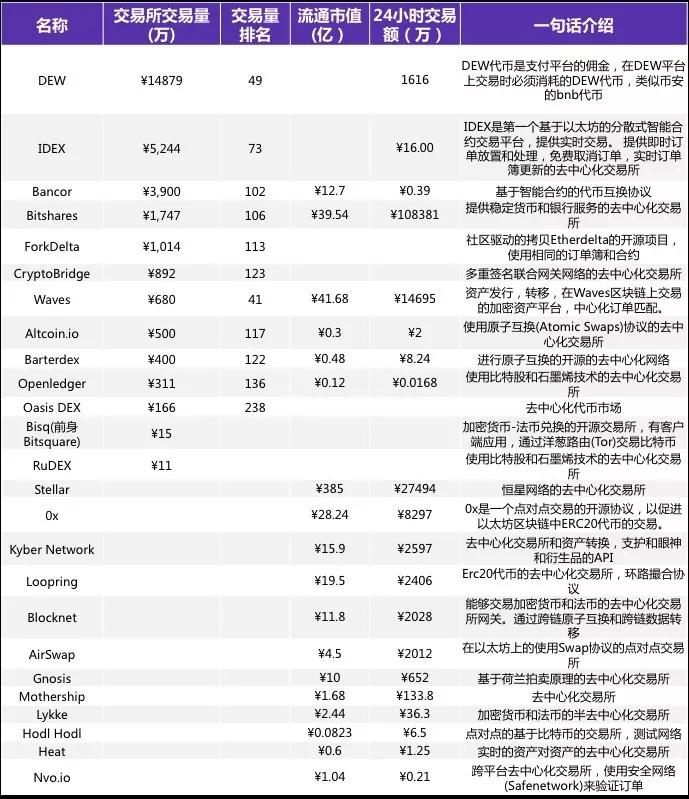 据不完全统计,目前可以找到的去中心化交易所/币种总数44个,其中上线并拥有交易量的去中心化交易所14个,交易协议开发中但已发行代币的12个。这些去中心化交易所与目前全球排名靠前的中心化交易所在规模上还有较大差距: