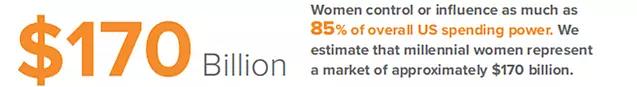 原因很明显,这些自1982年到2000年出生的千禧一代人群,正在成为消费主力军,而聪明人都不希望miss掉这个当下最赚钱的机会。数据显示,仅在美国,千禧一代人群每年的消费力达2000亿美元,有望超过以往任何一代人成为消费能力最强的群体。而这其中女性消费能力占比达85%,约1700亿美元。
