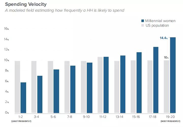 从市场的角度来看,千禧一代女性群体的市场价值主要凸显于其较高的消费金额及购买频率。此外,千禧一代女性中的多数有在特定时间段内进行购物的习惯,而且会在比其他群体消费支出高出25%
