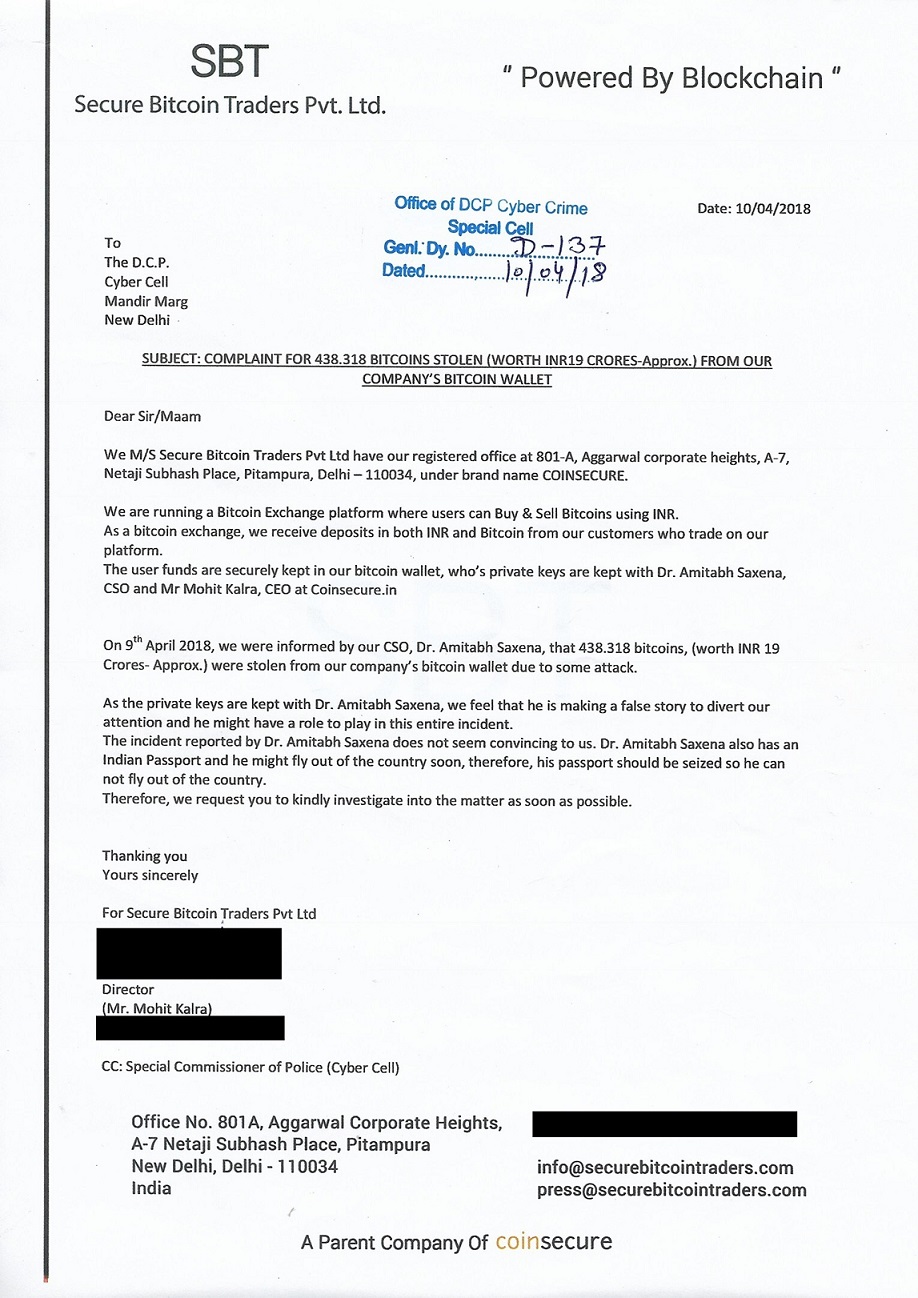 Kalra在2014年成立了Coinsecure,他说只有他和Saxena拥有交易所钱包的私钥。
