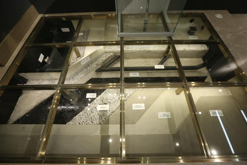 透过实楼里的墙体剖面,可以看到金茂铺设的毛细管网以及壁布饰面的七道工序,墙面上增加的抗裂玻纤网能有效防止墙面裂纹。